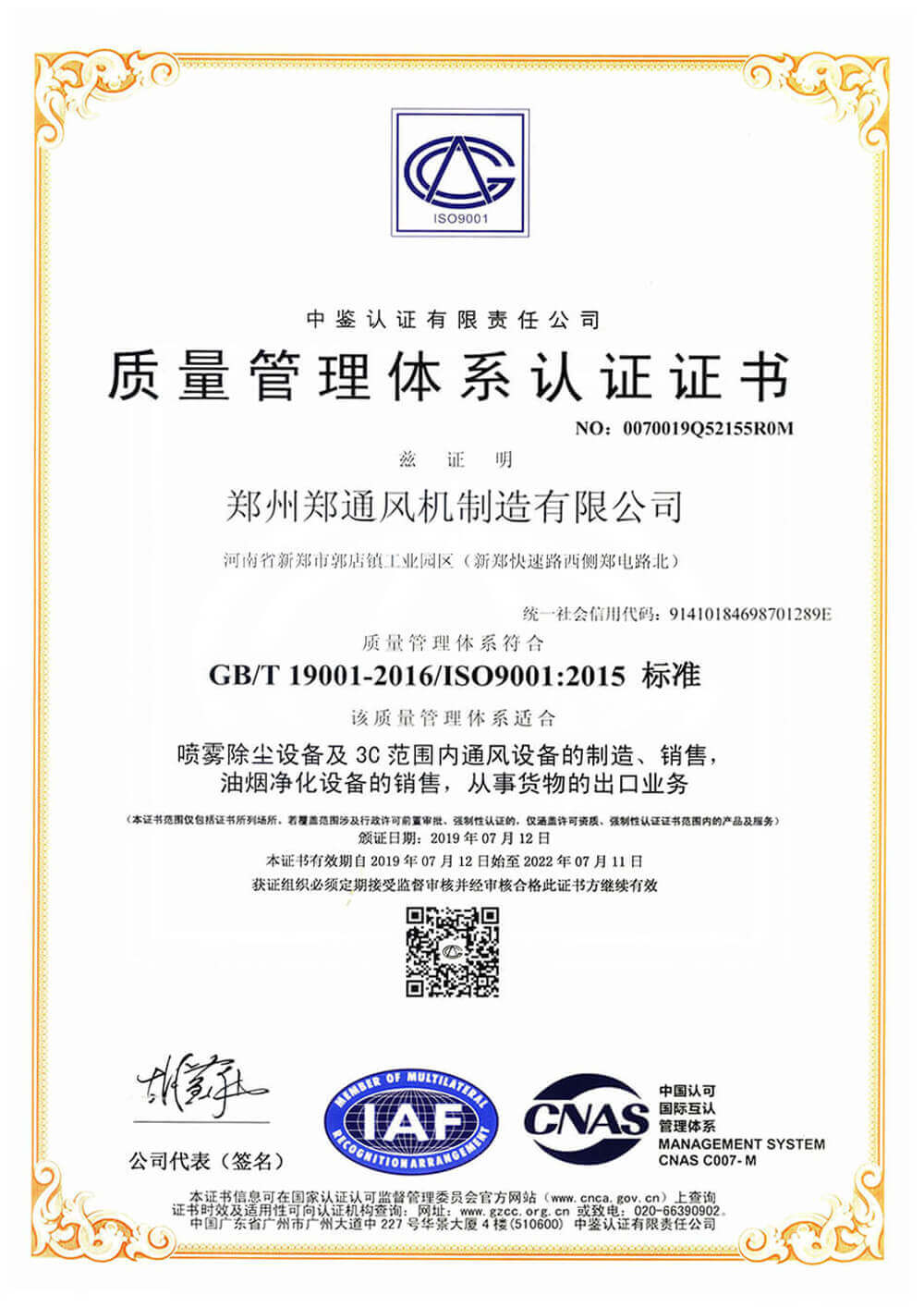 質量管理體系認證證書